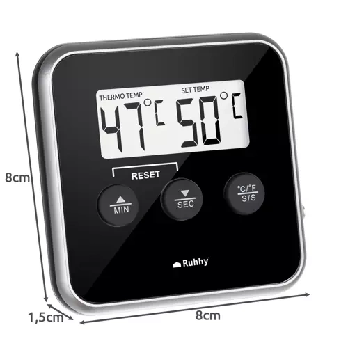 Digitalni kuhinjski termometar sa sondom nezamjenjiv je alat za preciznu pripremu mesa, umaka, ulja i drugih jela. Ima veliki i jasan LCD zaslon, magnet za pričvršćivanje na hladnjak/pećnicu/roštilj i zvučni alarm koji vas upozorava kada se postigne zadana temperatura. Zbog širokog raspona mjerenja prikladan je za korištenje u pećnici, na roštilju, u pušnici ili čak u hladnjaku.