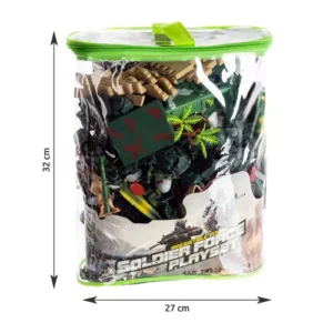 Ovaj izniman set sadrži vrlo velik broj elemenata. Set Uključuje: vojnike, oružje, tenkove, avione, puške, zgrade, ograde, drveće i mnoge druge dodatke koji će vam omogućiti stvaranje jedinstvene ratne scene. Igračka je savršena i kod kuće u kišnim danima i vani, na primjer, u parku ili na igralištu. Set nalazi se u torbi s patentnim zatvaračem i ručkom, što olakšava spremanje i nošenje. Set potaknut će maštu vašeg djeteta. O djetetu ovisi kako će izgledati bojno polje i kako će se razvijati stvorena priča. Figure Izrađene su od visokokvalitetne plastike, što ih čini otpornima na udarce i padove. Svaki figura Ima ravnu podlogu tako da se ne prevrće.