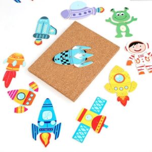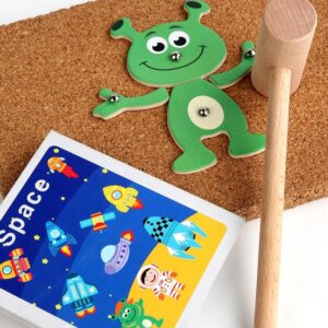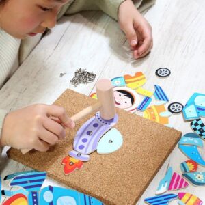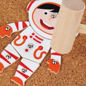 A gyermek először a szöget a parafa lapba szúrhatja, majd biztonságosan megütheti a kalapáccsal, anélkül, hogy megsérülne.