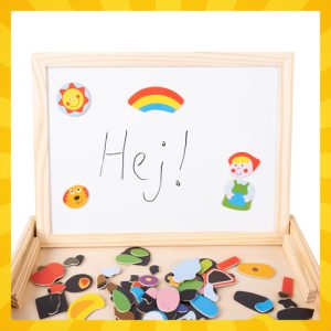 • 🖍️ Kétoldalas tábla – Két szórakoztató világ egyben: fehér mágneses felület összerakáshoz és filctollal rajzoláshoz, valamint fekete krétatábla szabad alkotáshoz krétával.