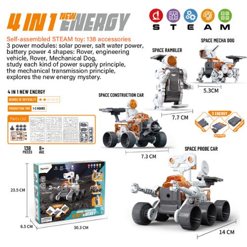 Če želiš komplet, ki je hkrati zabaven in poučen, je ta “vesoljska dogodivščina” odlična izbira. Otrok sestavi model in skozi igro spoznava mehanski prenos ter različne vire energije. Posebnost kompleta je, da omogoča 3 načine napajanja: sončno energijo, energijo iz slane vode (kemična energija) in električno energijo. Super za radovedne otroke, ki jih zanimata znanost in trajnost.