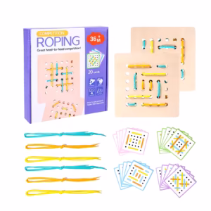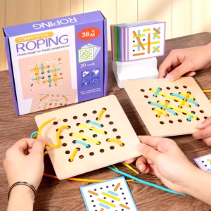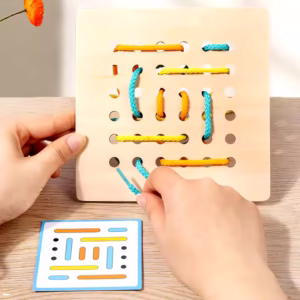 🎨 Ustvari vzorce z barvnimi vrvicami – Ta zabavna in poučna igra vključuje lesene plošče z luknjami, barvne vrvice in kartice z različnimi vzorci. Otroci uporabljajo vrvice za prepletanje skozi luknje in ustvarjanje vzorcev, prikazanih na karticah.