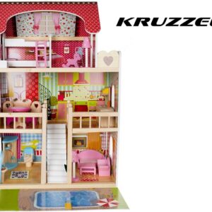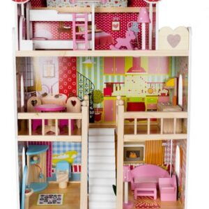 • PRIESTRANNÝ - drevený domček pre bábiky je určený pre rodinu so 4 bábikami. Má 3 poschodia spojené krásnymi bielymi schodmi, 5 izieb + balkón a záhradu s bazénom. O takomto veľkom dome sníva každé dievčatko!